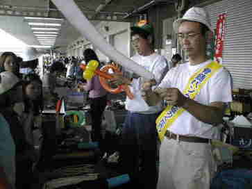 | ペンシルバルーンをチャリティーで一ヶ100円以上の募金をして頂きました。 動物や花など作るのに大忙し。 ![]() 千葉から応援に来てくださった円東さんに、感謝感謝です。 |